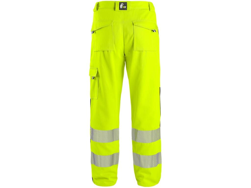 Pánské výstražné kalhoty se segmentovanými reflexními pásky (šířka 7 cm) - zkrácená varianta na výšku 170-176 cm. Pevná keprová vazba zajišťuje pevnost a odolnost materiálu. Kalhoty jsou zapínány krytým zipem a plastovým knoflíkem. Pas s poutky na op .