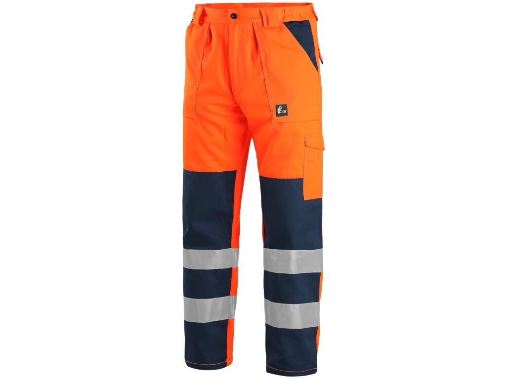 Pánské výstražné kalhoty - zkrácená varianta na výšku 170-176 cm. Pas s poutky na opasek a gumou v bocích, 2 přední kapsy, 2 zadní kapsy, kryté přední zapínání na zip, levá boční kapsa s menší kapsou na tužku, 3M reflexní pásky (šíře 7 cm). Doporučen .