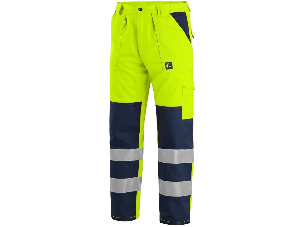 Pánské výstražné kalhoty - zkrácená varianta na výšku 170-176 cm. Pas s poutky na opasek a gumou v bocích, 2 přední kapsy, 2 zadní kapsy, kryté přední zapínání na zip, levá boční kapsa s menší kapsou na tužku, 3M reflexní pásky (šíře 7 cm). Doporučen .